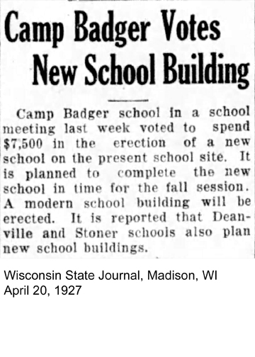The District No. 10 school board was established in 1857 and like most of the other districts voted to collect taxes to pay $125 to build a school and $30 to pay a teacher for three months during the summer. The building was to be 20 by 26 feet square and be situated in the northwest corner of section 8 or as close as possible to that site. The 1861 plat map shows the school was on the southwest corner of section 5, just across the street from its proposed location. In 1888, a proposal was made to build a new school but that proposal was defeated and instead a motion was made and approved to renovate the current building. A document from about 1910 lists the school as Summit School, District No. 10 and gives the names of the teacher, 17 students ages 6 to 14 (from the 1910 census) and the three school board members. This appears to be an appropriate name as the school was built on top of a hill. By 1922, the school was named District No. 10 Camp Badger.