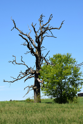 - Tree 1 on Vroman Farmstead, Seminole and Vroman Rd (dead but still standing); 42o 59′ 05.77” N 89o 27′ 51.60” W