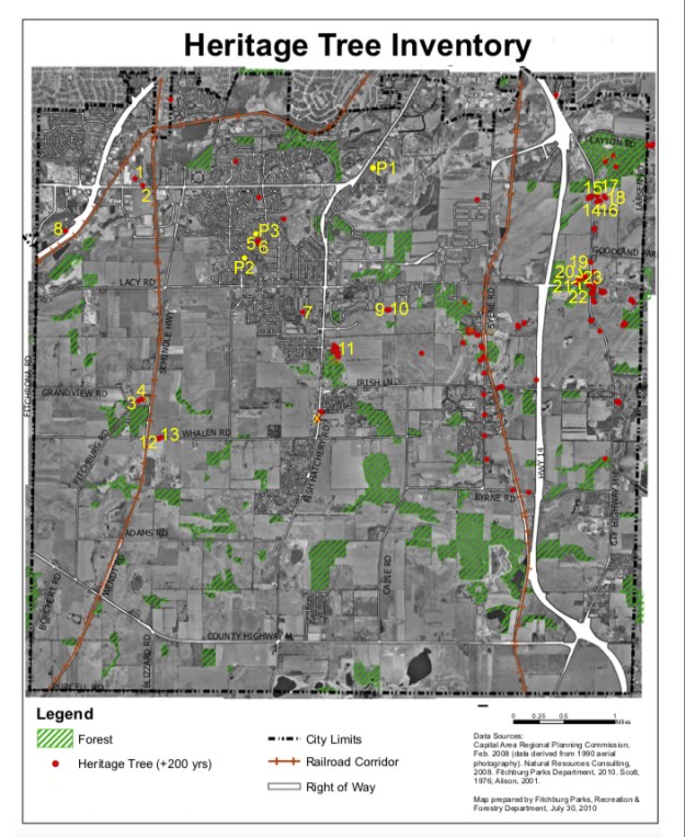 The city developed a map showing the locations of the Heritage and Specimen Trees in Fitchburg. We have modified this map to show only the Heritage Trees (see below) and are placing a number on the map by each Heritage Tree that is still standing. The numbered list below has links to 2020 photographs of the trees. We are requesting FHS members and anyone interested to use this map to 1) help identify those Heritage Trees that have been cut down (will place an X on the map); 2) take photographs of the Heritage Trees that are still standing (the city does not have photographs of the old Heritage Trees); and 3) to identify new Heritage Trees in Fitchburg. This information is being shared with the city.