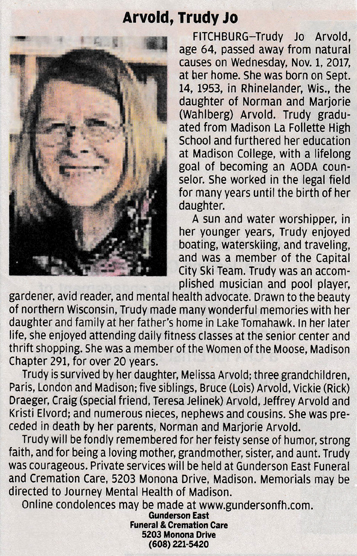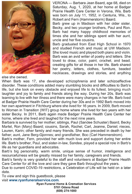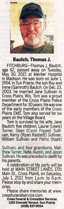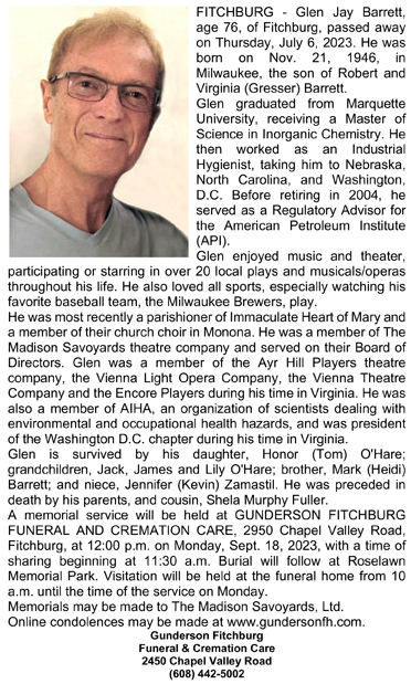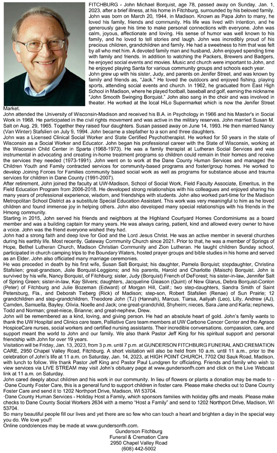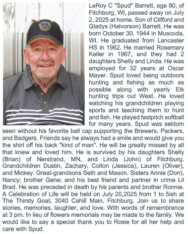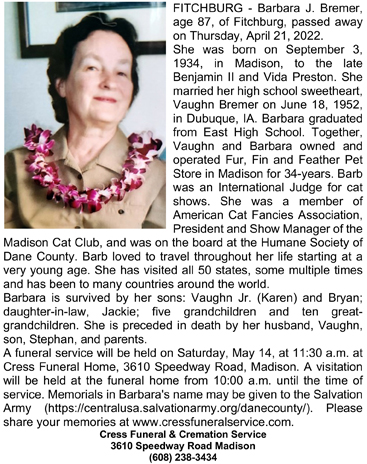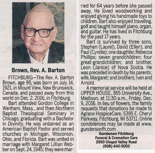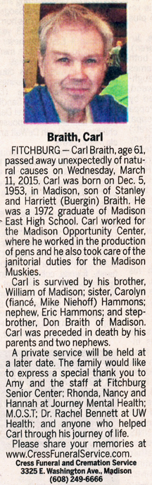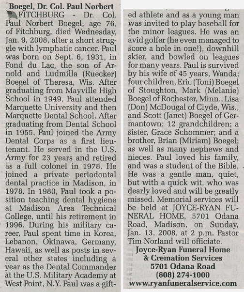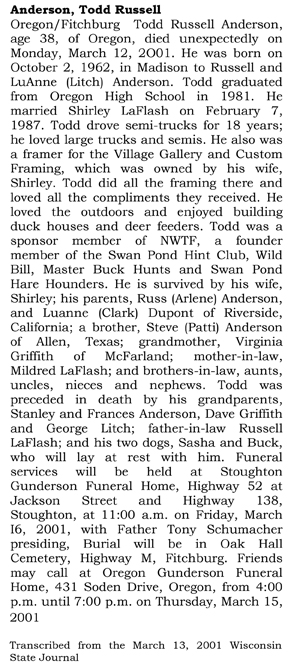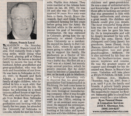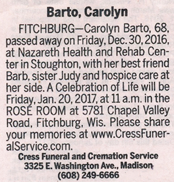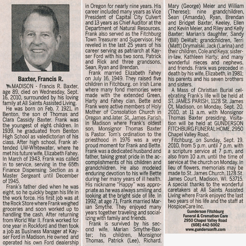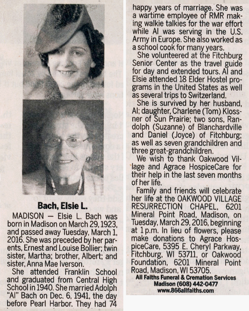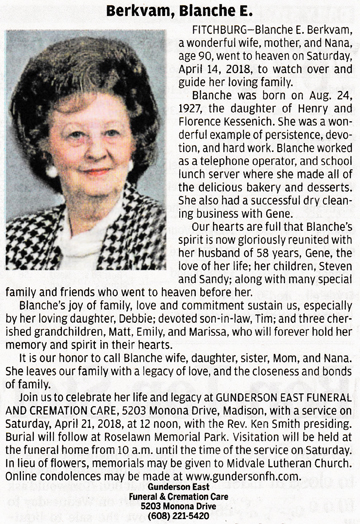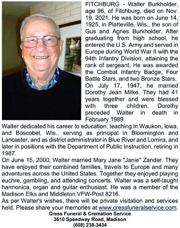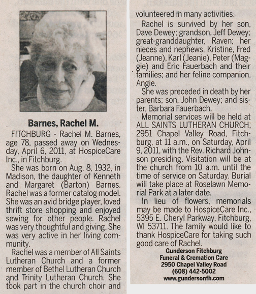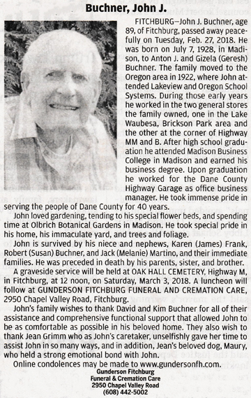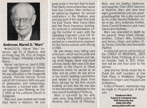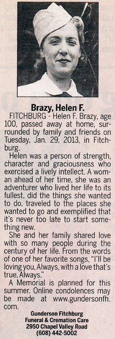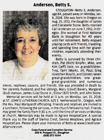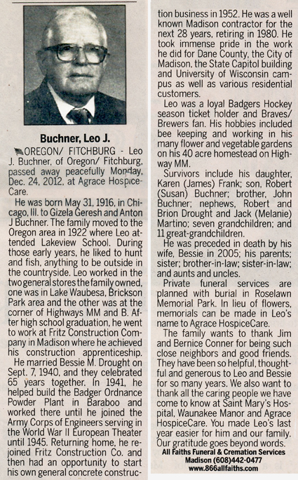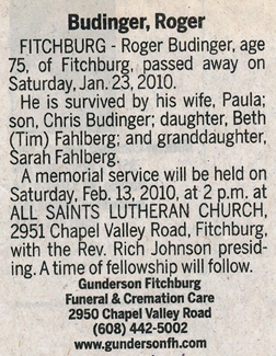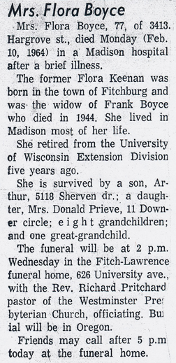 The list below contains names of people associated with Fitchburg, Wisconsin whose last names begin with A or B for which we have obituaries. After each name there may be Obit and/or Cemetery in blue type. Click on these links to see the obituary image and cemetery information. Use the back arrow on your browser to return to this webpage. Some obituaries have been reformatted to provide better readability. If you would like to see a hard copy of an obituary please contact us so we can make appropriate arrangements to show you or send you a copy of the obituary. A list of all the names associated with an obituary can be searched in our FHS Obituary Database.