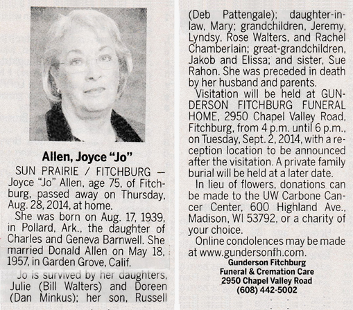 Allen, Joyce “Jo” (nee Barnwell) Obit Cemetery