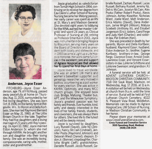 Anderson, Joyce Esser (nee Kortbein) Obit Cemetery