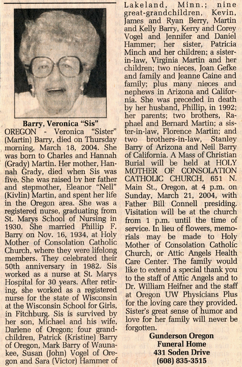 Barry, Veronica “Sis” (nee Martin) Obit Cemetery