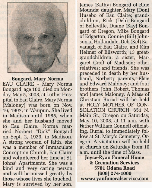 Bongard, Mary Norma (nee Maloney) Obit Cemetery