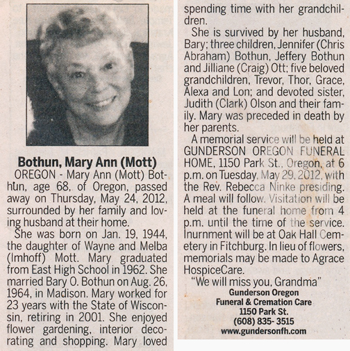 Bothun, Mary Ann (nee Mott) Obit Cemetery