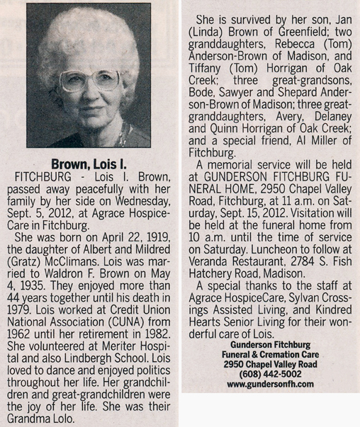 Brown, Lois I. (nee McClimans) Obit Cemetery
