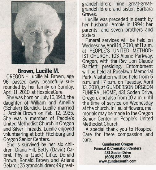 Brown, Lucille M (nee Burdick) Obit Cemetery