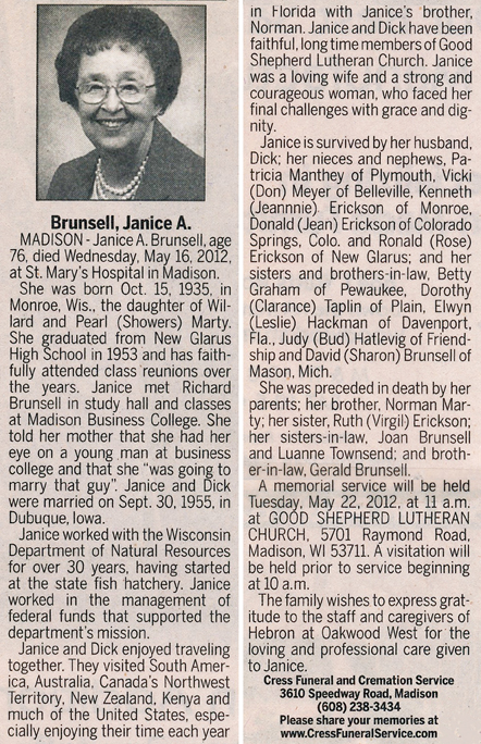 Brunsell, Janice Ann (nee Marty) Obit Cemetery