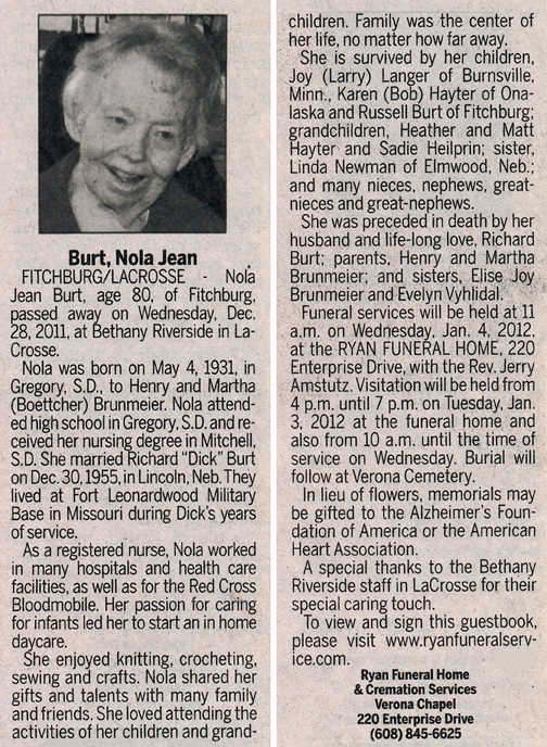 Burt, Nola Jean (nee Brunmeier) Obit Cemetery