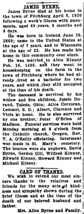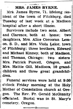 Byrne, Alice (nee Kinney) Obit Cemetery