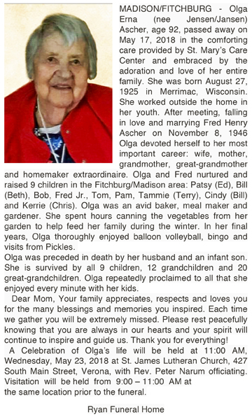 Ascher, Olga Erma (nee Jensen/Jansen) Obit Cemetery