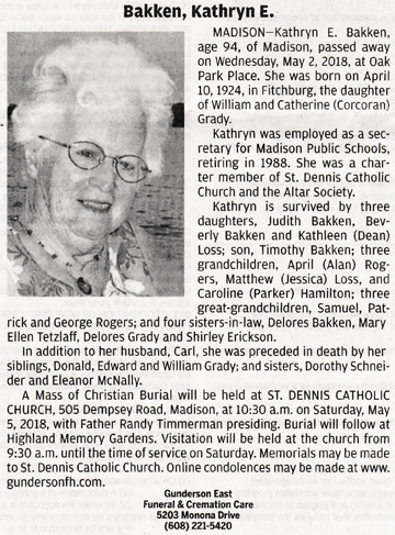 Bakken, Kathryn E (nee Grady) Obit Cemetery