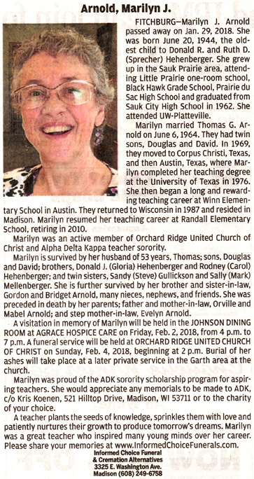 Arnold, Marilyn J. (nee Hehenberger) Obit