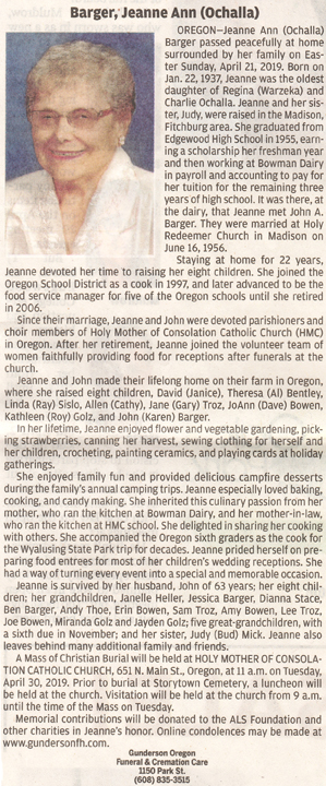 Barger, Jeanne Ann (nee Ochalla) Obit Cemetery