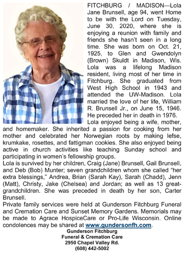 Brunsell, Lola Jane (nee Skuldt) Obit Cemetery
