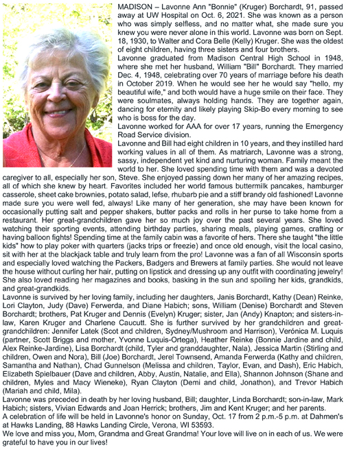 Borchardt, Lavonne Ann “Bonnie” (nee Kruger) Obit Cemetery