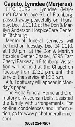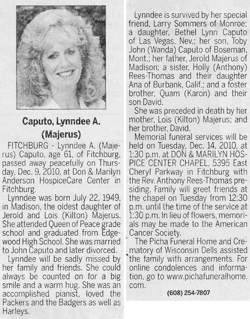 Caputo, Lynndee (nee Majerus) Obit 1 Obit 2 Cemetery