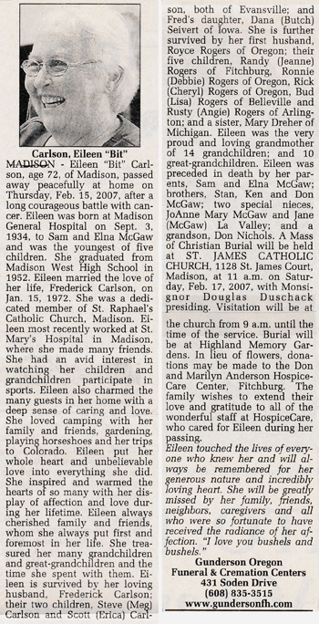 Carlson, Eileen C “Bit” (nee McGaw) Obit Cemetery