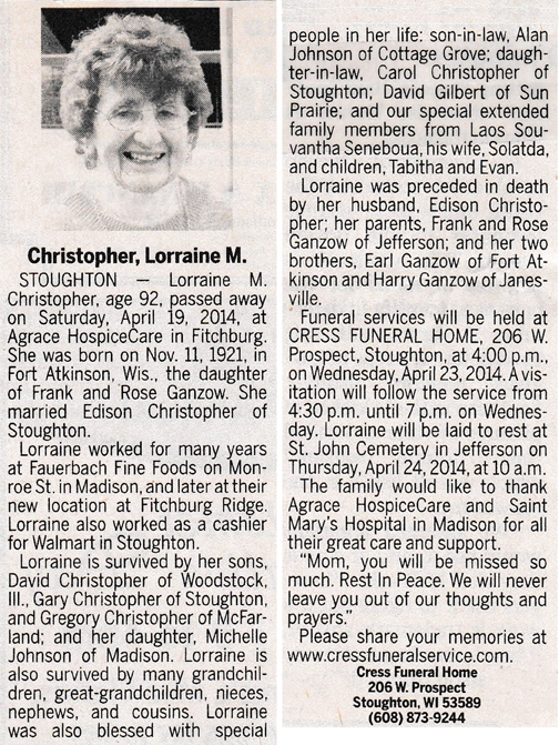 Christopher, Lorraine M. (nee Ganzow) Obit Cemetery