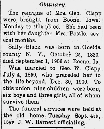 Clapp, Sally (nee Black) Obit Cemetery