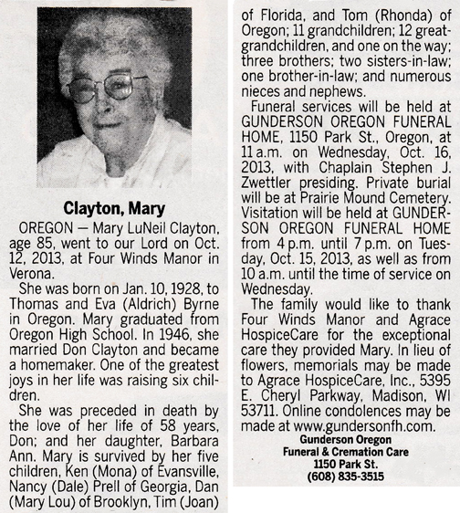 Clayton, Mary Luneil (nee Byrne) Obit Cemetery