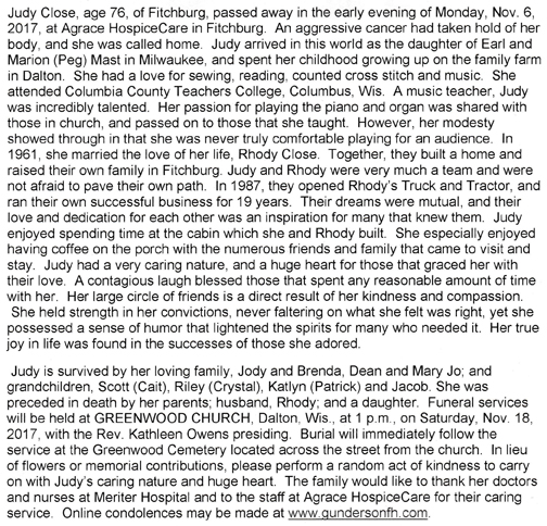 Close, Judy nee Mast) Obit