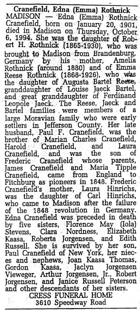 Cranefield, Edna (nee Rothnick) Obit Cemetery