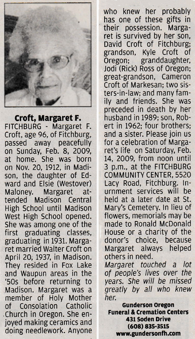 Croft, Margaret F. (nee Maloney) Obit Cemetery