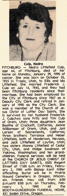 Culp, Nedra (nee Littlefield) Obit 1 Obit 2