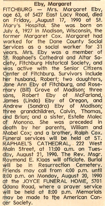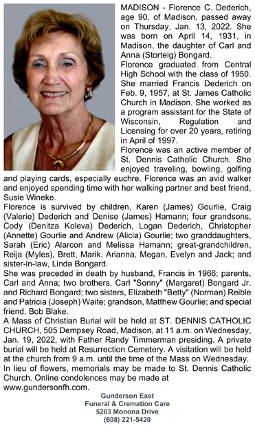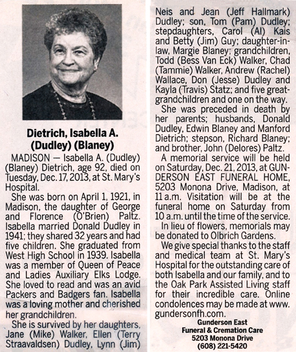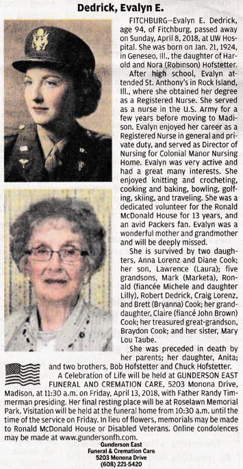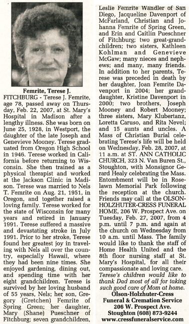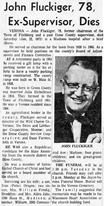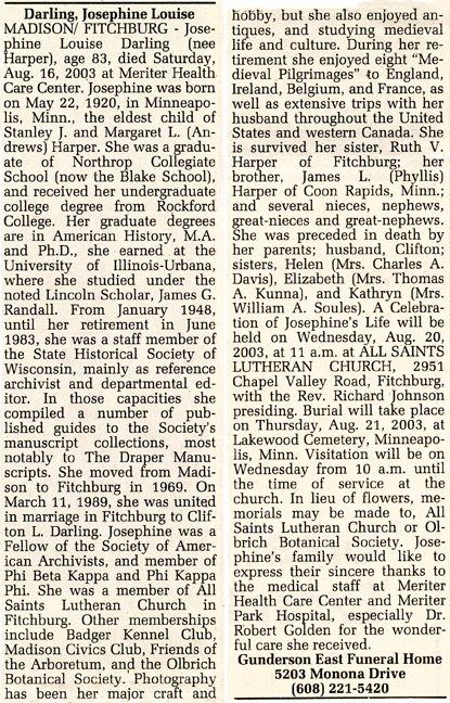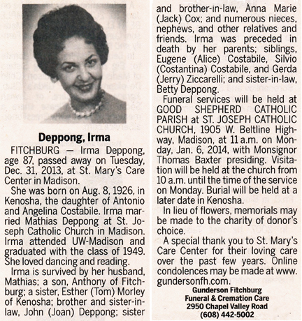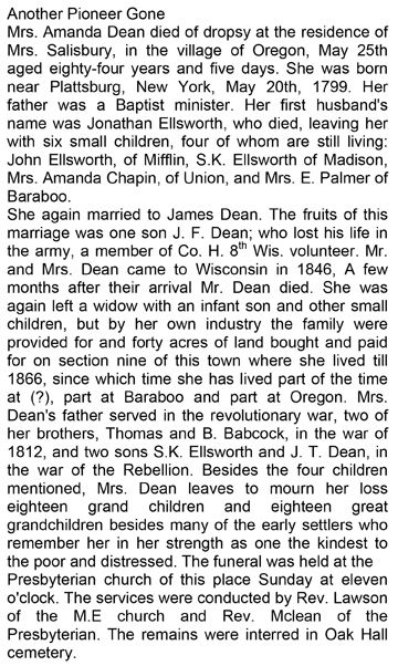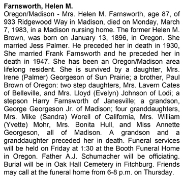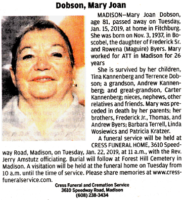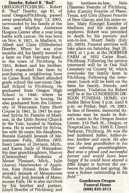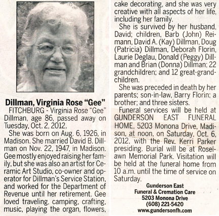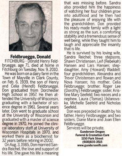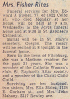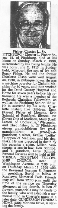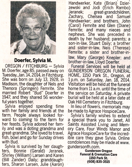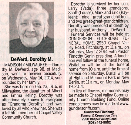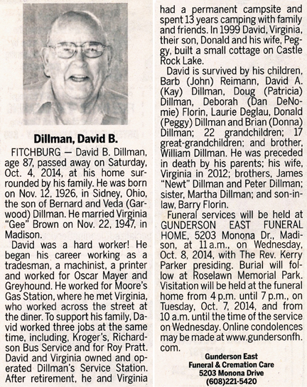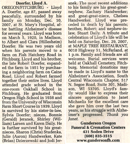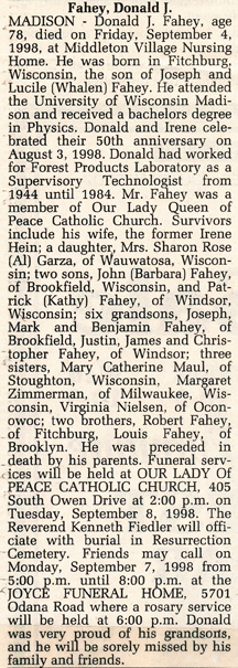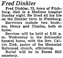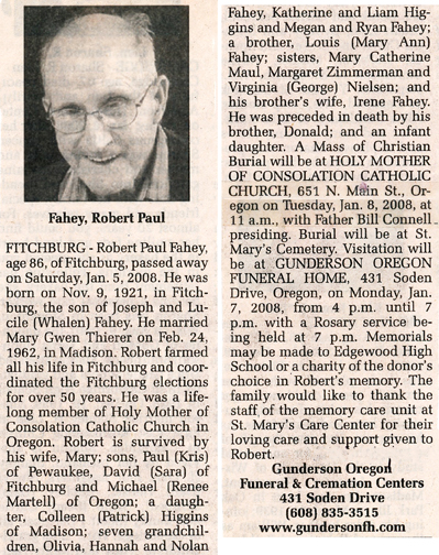 The list below contains names of people associated with Fitchburg, Wisconsin whose last names begin with C, D, E, F or G for which we have obituaries. After each name there may be Obit and/or Cemetery in blue type. Click on these links to see the obituary image and cemetery information. Use the back arrow on your browser to return to this webpage. Some obituaries have been reformatted to provide better readability. If you would like to see a hard copy of an obituary please contact us so we can make appropriate arrangements to show you or send you a copy of the obituary. A list of all the names associated with an obituary can be searched in our FHS Obituary Database.