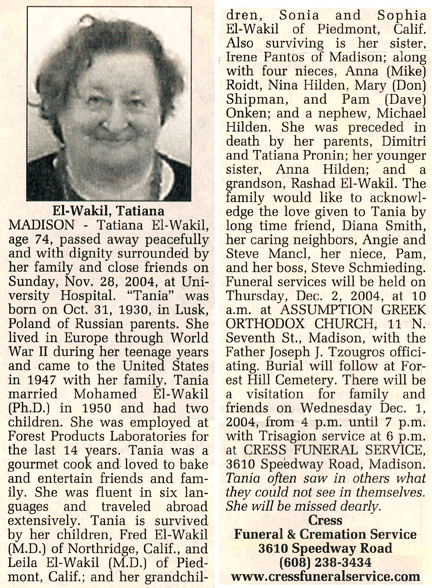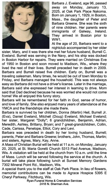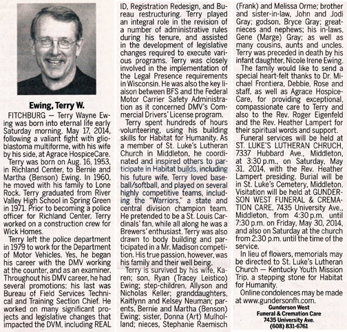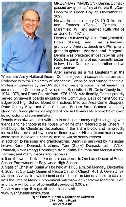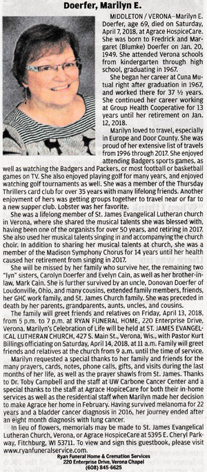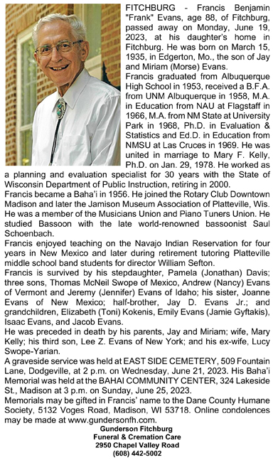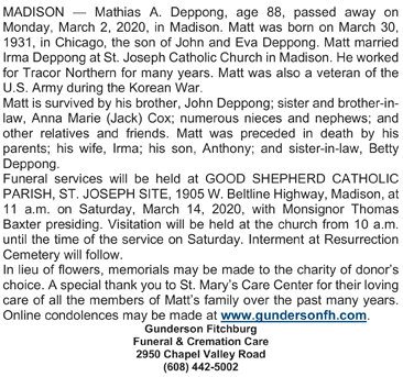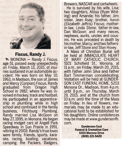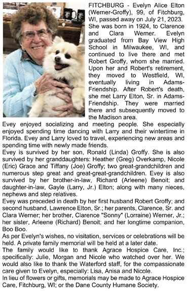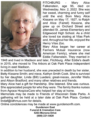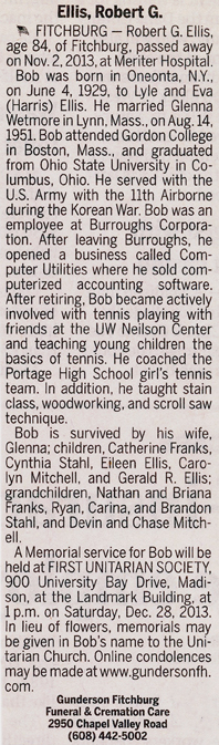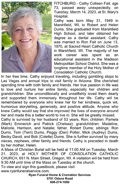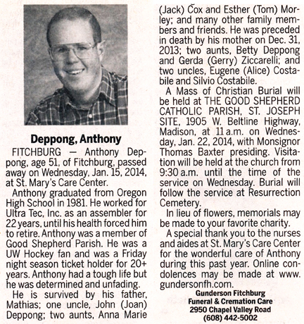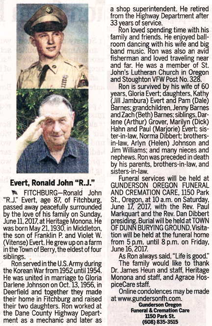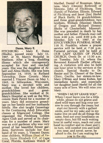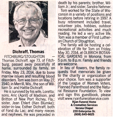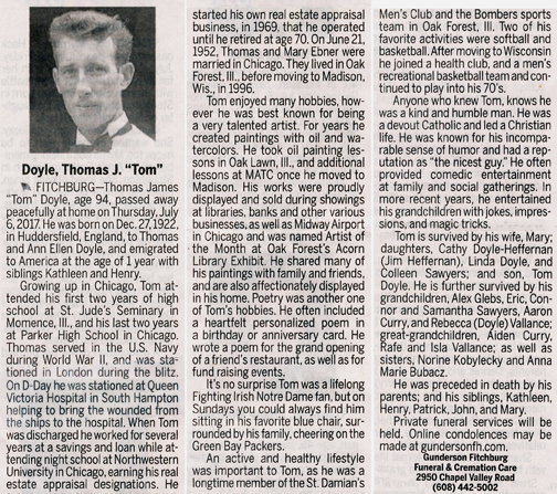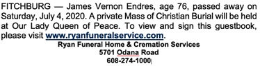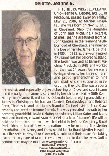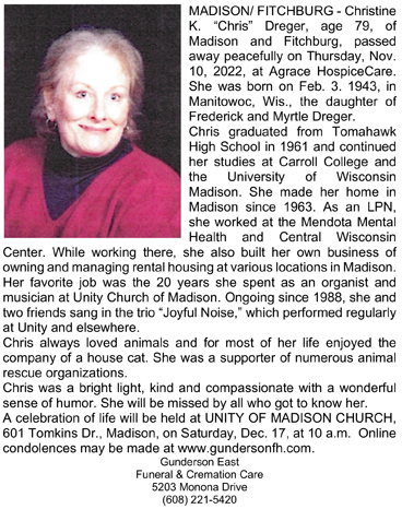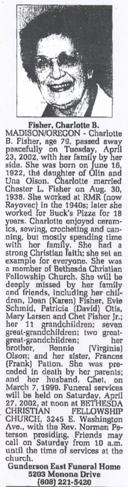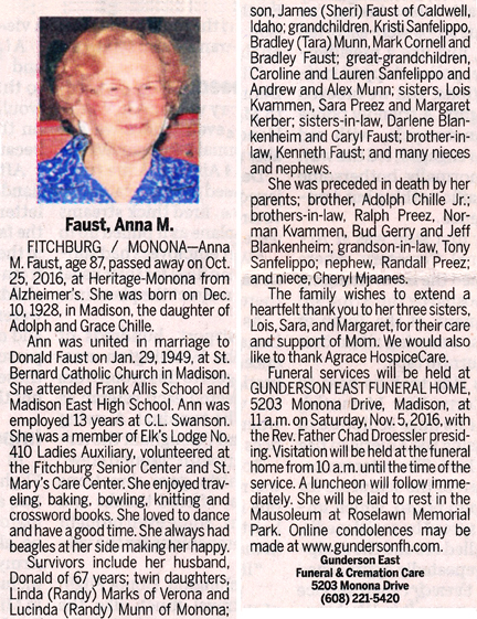 The list below contains names of people associated with Fitchburg, Wisconsin whose last names begin with C, D, E, F or G for which we have obituaries. After each name there may be Obit and/or Cemetery in blue type. Click on these links to see the obituary image and cemetery information. Use the back arrow on your browser to return to this webpage. Some obituaries have been reformatted to provide better readability. If you would like to see a hard copy of an obituary please contact us so we can make appropriate arrangements to show you or send you a copy of the obituary. A list of all the names associated with an obituary can be searched in our FHS Obituary Database.