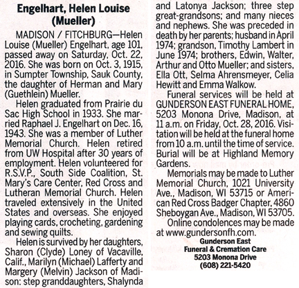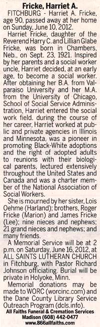Fricke, Harriet Adele obit Cemetery