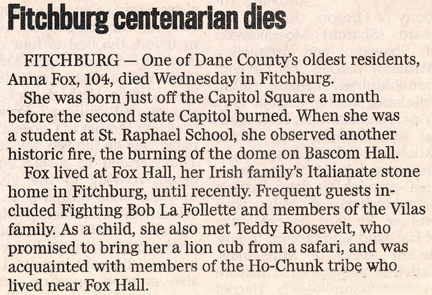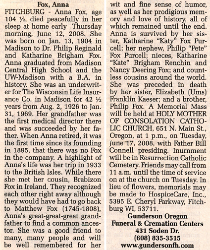 Fox, Anna obit 1 obit 2 Cemetery