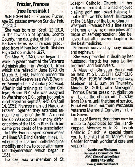 Frazier, Frances (nee Teresinski) obit Cemetery