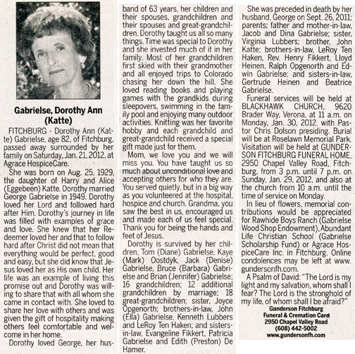 Gabrielse, Dorothy Ann (nee Katte) Obit Cemetery