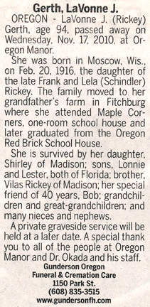 Gerth, LaVonne J. Obit Cemetery
