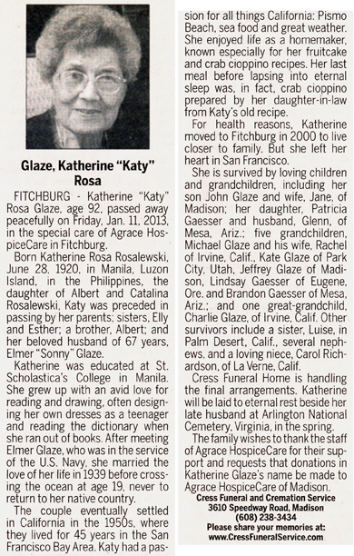 Glaze, Katherine “Katy” Rosa (nee Rosalewski) Obit Cemetery