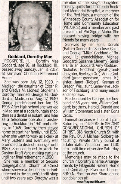 Goddard, Dorothy Mae (nee Stoneman) Obit