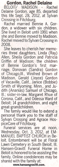 Gordon, Rachel Delaine Obit Cemetery