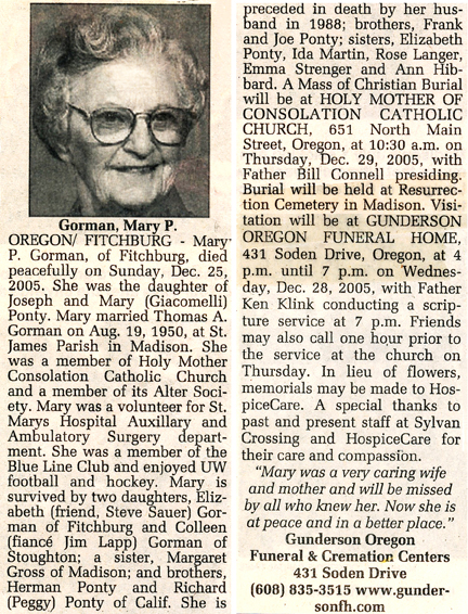 Gorman, Mary P. (nee Ponty) Obit Cemetery
