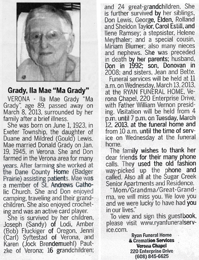 Grady, Ila Mae “Ma Grady” (nee Lewis) Obit Cemetery