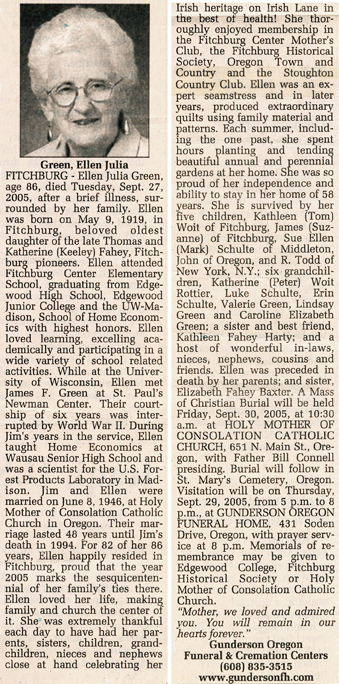 Green, Ellen Julia (nee Fahey) Obit Cemetery