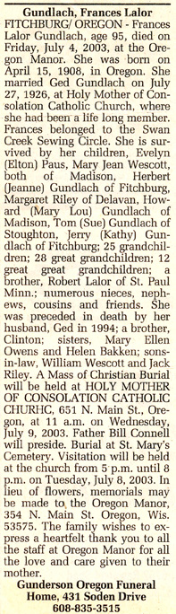 Gundlach, Frances (nee Lalor) Obit Cemetery