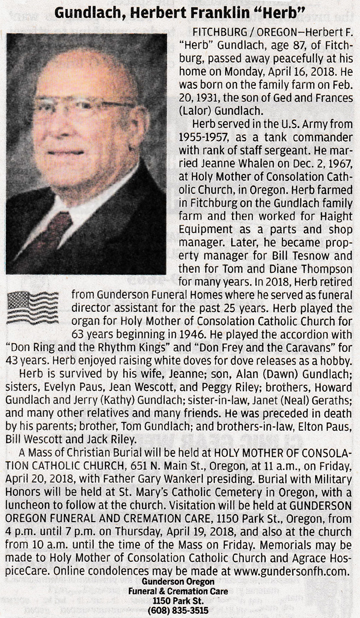 Gundlach, Herbert Franklin “Herb” Obit Cemetery