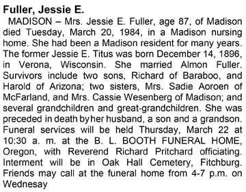 Fuller, Jessie (nee Titus) Obit Cemetery