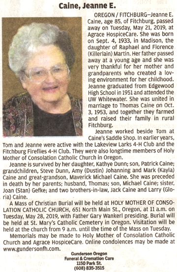 Caine, Jeanne E. (nee Martin) Obit Cemetery