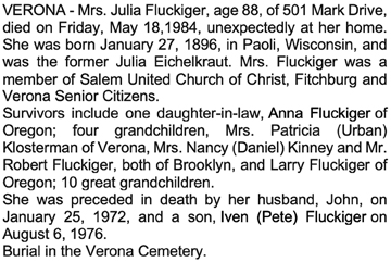 Fluckiger, Julia Katherine (nee Eichelkraut) Obit Cemetery