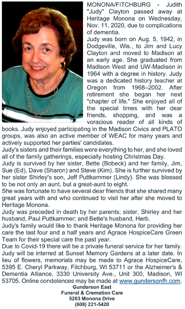 Clayton, Judith “Judy” Obit Cemetery