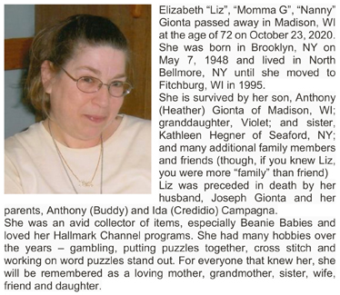 Gionta, Elizabeth M.”Liz” (nee Campagna) Obit 1 Obit 2 Cemetery