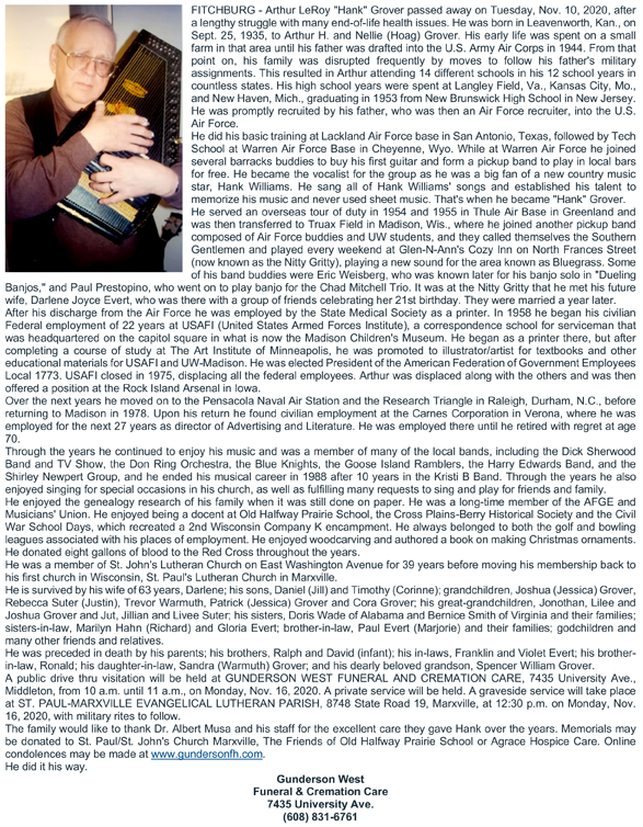 Grover, Arthur LeRoy “Hank” Obit Cemetery